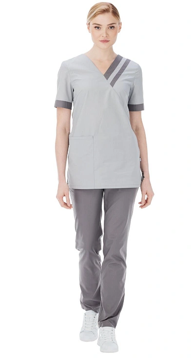 Блуза удлиненная полуприлегающего силуэта. V-образный вырез горловины. Асимметричное решение в верхней части с планками из отделочной ткани. Вместительный нижний накладной карман. Рукава длиной выше локтя с отделкой по низу. На спинке полупояса для регулировки объема блузы.