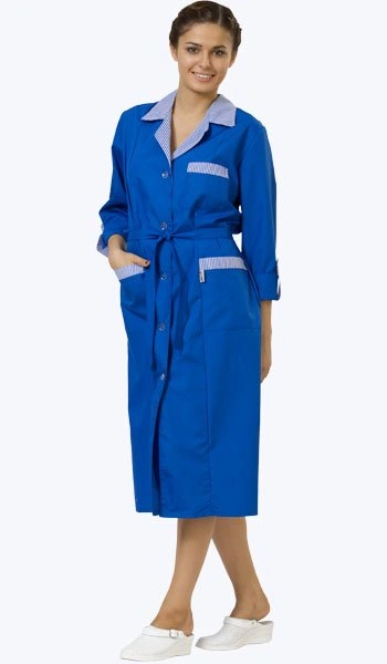 Универсальный современный халат для предприятий сферы обслуживания и торговли с вертикальными рельефами, центральной бортовой застежкой на пуговицы. Английский воротник и отделка накладных карманов, хлястики на рукавах, из ткани в мелкую полоску. Рукав длинный, который при необходимости можно сделать длиной 3/4, с фиксацией хлястиком. Талия подчеркивается поясом.