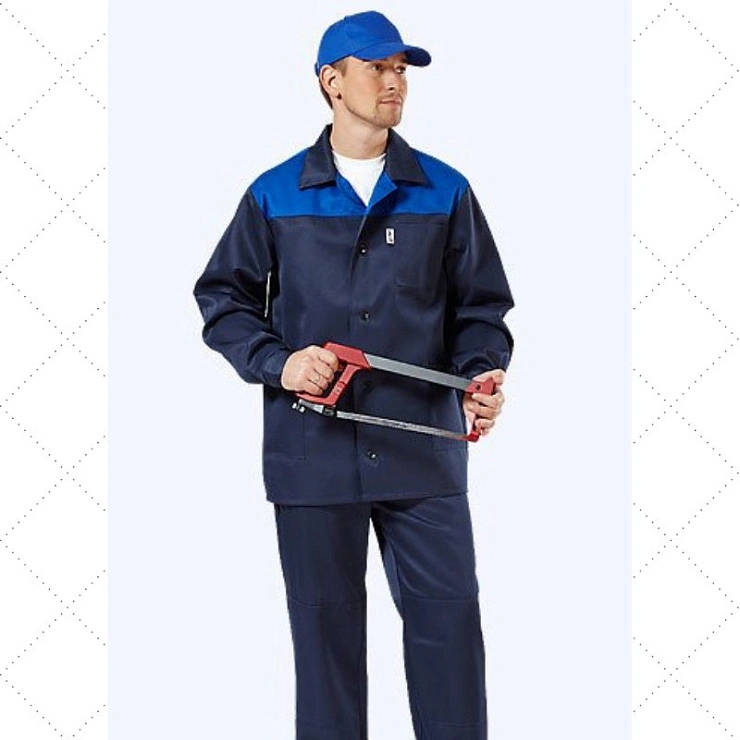 Костюм рабочий брючный. Куртка прямого силуэта с центральной застежкой на пуговицы, отложной воротник. Кокетки выполнены из отделочной ткани. Куртка оснащена нагрудным и двумя боковыми карманами. Брюки на притачном поясе. В области локтей и коленей усиления.