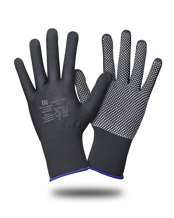 Перчатки из 100% нейлона 13-го класса вязки с микроточкой ПВХ. Цвет: черный, белая точка, отличная тактильная чувствительность отличная воздухопроницаемость, противоскользящее покрытие с повышенной стойкостью к истиранию широкий диапазон применения.