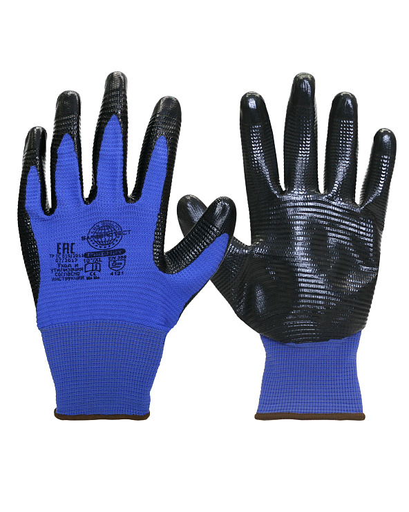 Перчатки из 100% нейлона, 13-го кл. вязки, цвет синий, рифленное нитриловое покрытие черного цвета. Отличная защита от истирания и разрыва. Повышенная стойкость покрытия к маслам, нефтепродуктам, кислотам и щелочам. Отличны захват и сцепление, отличная воздухопроницаемость широкий диапазон покрытия.